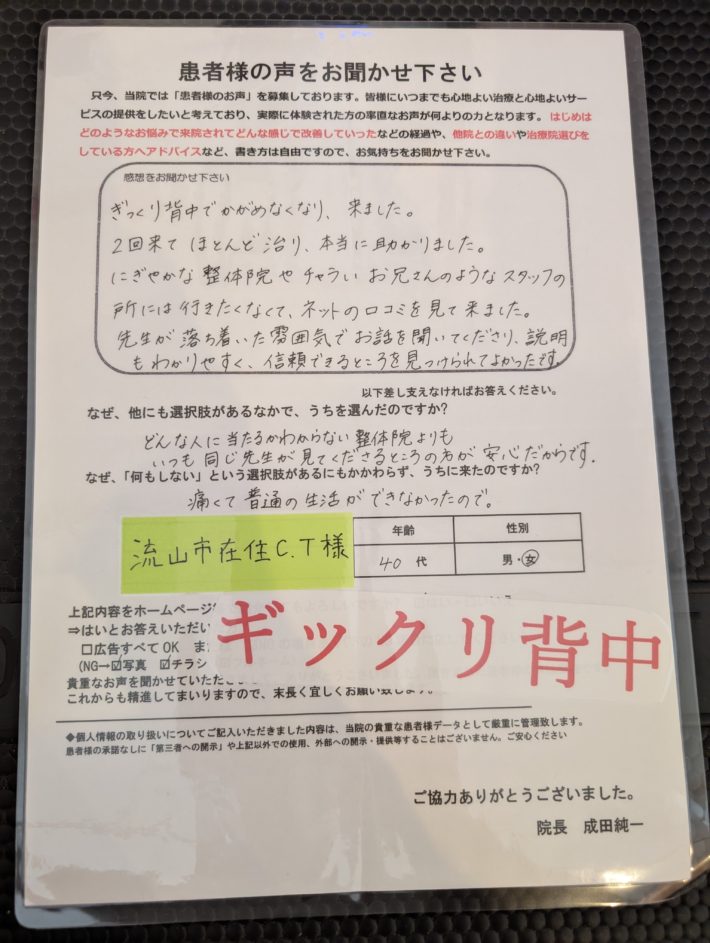 初回に施術を受けてから前にかがめるようになり、2回目の通院では痛みなく生活できるようになりました。